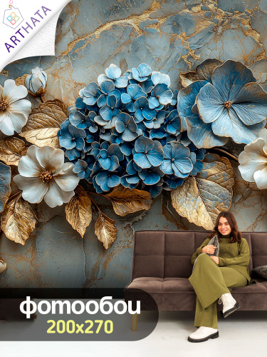 Фотообои 3D Голубая гортензия с золотыми листьями 200x270