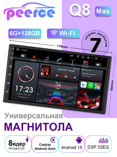 Магнитола Peerce 6+128Gb, 7 дюймов универсальная, Android 15,8-ми ядерный процессор, QLED экран, DSP, 2din, С камерой