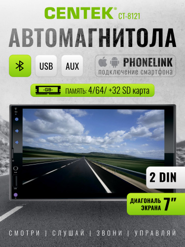 Магнитола для авто 2 din Centek CT-8121 / автомагнитола 7 дюймов, LCD, Bluetooth, ПУЛЬТ управления, FM-радио, MP3, эквалайзер