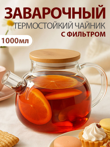 Чайник заварочный стеклянный Ozon home с бамбуковой крышкой, 1050 мл