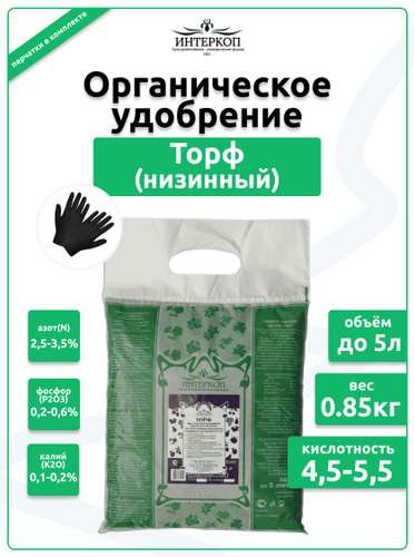 Кислый торф низинный, удобрение для рассады, цветов и растений Интеркоп, 0.9кг/5л