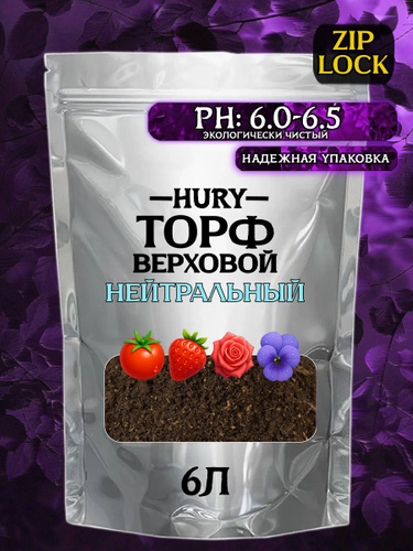Торф нейтральный для растений и цветов, HURY, 6Л, удобрение