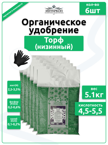 Кислый торф низинный, удобрение для рассады, цветов и растений Интеркоп 6шт(до 5 л/шт), 5.5кг/30л