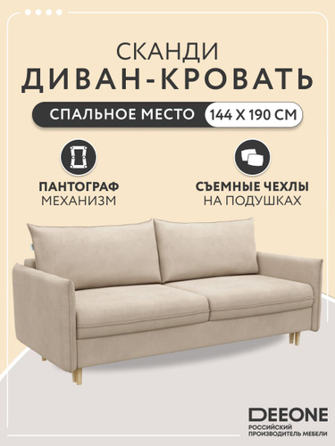 Диван-кровать раскладной прямой на ножках Сканди в гостиную, пантограф, двуспальный, велюр, бежевый, 212х96х90