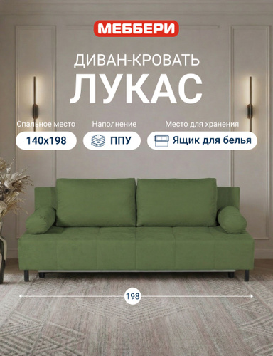 Диван-кровать раскладной прямой Лукас, механизм Еврокнижка, 196*86*88, зеленый (велюр Omega 62)