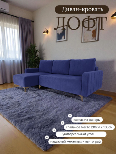 Диван кровать угловой Лофт, на ножках, раскладной, в гостиную, велюр синий, 235x100x95 см