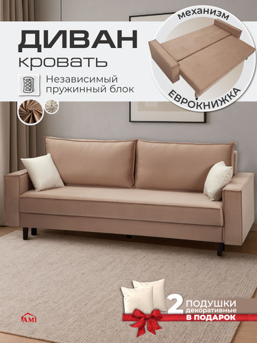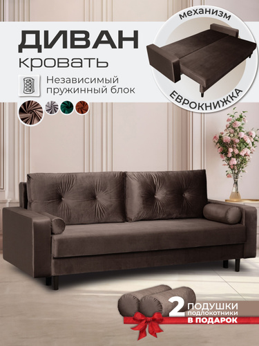 AMI MEBEL Диван раскладной прямой двухспальный в гостиную, диван кровать лофт, механизм еврокнижка, спальное место 148х191,5 см, независимый пружинный блок, бархат коричневый, высокие деревянные ножки