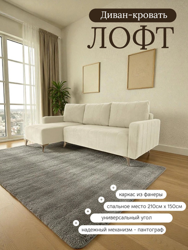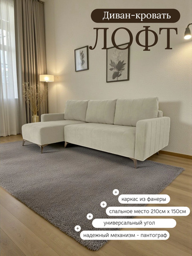 Диван кровать угловой Лофт, на ножках, раскладной, в гостиную, велюр светло-бежевый, 235x100x95 см