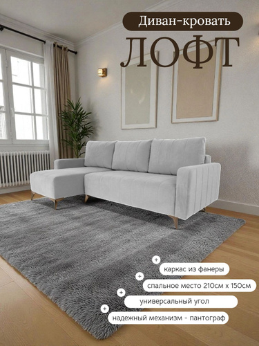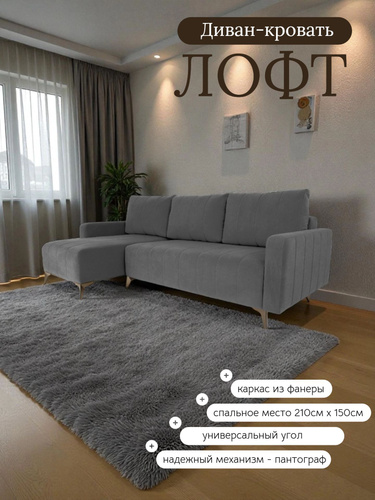 Диван кровать угловой Лофт, на ножках, раскладной, в гостиную, велюр серый, 235x100x95 см