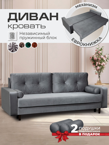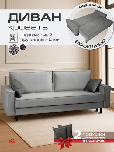 AMI MEBEL Диван раскладной прямой двухспальный в гостиную, диван кровать лофт, механизм еврокнижка, спальное место 148х191,5 см, независимый пружинный блок, бархат серый, высокие деревянные ножки