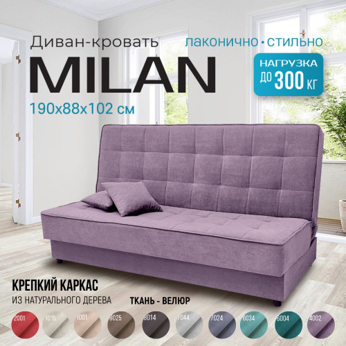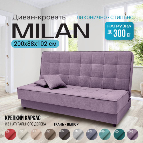 Диван кровать раскладной MILAN лофт прямой двухспальный без подлокотников, на ножках, ткань велюр, механизм книжка, с ящиком для хранения, с подушками, цвет: пастельно фиолетовый, 190х140 см.