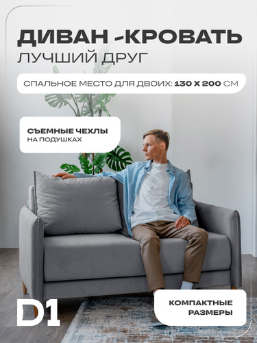 Диван кровать раскладной прямой, Лучший друг D1, на ножках, мини, аккордеон-евро, велюр, серый, 148x89x87
