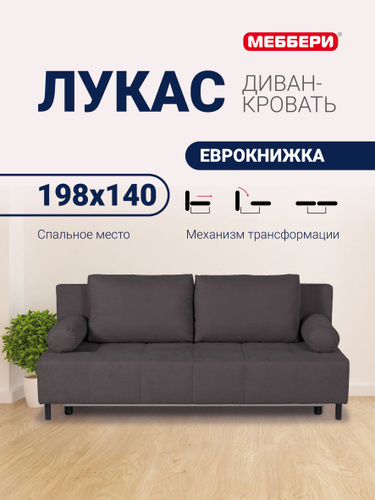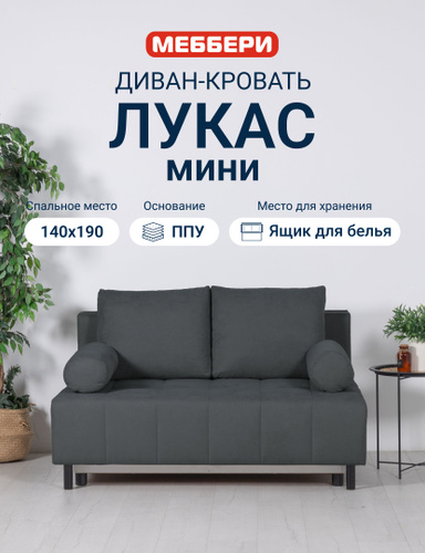 Меббери Диван-кровать раскладной прямой Лукас мини, с ящиком для хранения, размер 144*110*88 см, механизм еврокнижка, темно-серый (велюр Omega 27)
