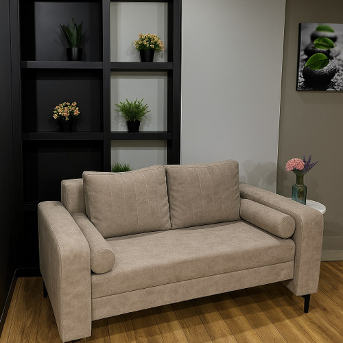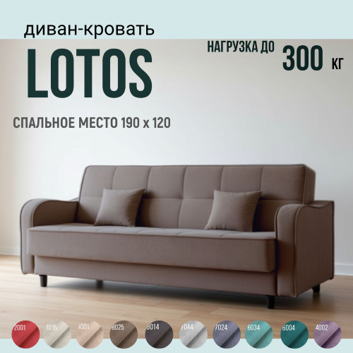 Диван кровать раскладной LOTOS прямой двухместный с подлокотниками, на ножках, ткань велюр, механизм книжка, с ящиком для хранения, с подушками, цвет: бледно-коричневый, 190х120 см.