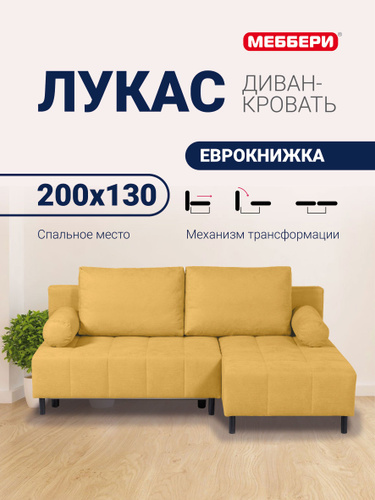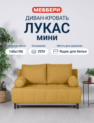 Меббери Диван-кровать раскладной прямой Лукас мини, с ящиком для хранения, размер 144*110*88 см, механизм еврокнижка, желтый (велюр Omega 56)