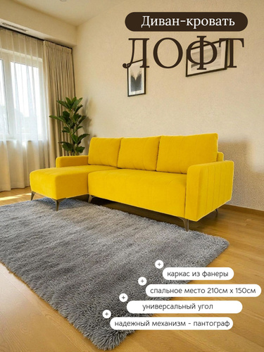 Диван кровать угловой Лофт, на ножках, раскладной, в гостиную, велюр горчичный, 235x100x95 см
