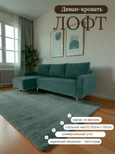Диван кровать угловой Лофт, на ножках, раскладной, в гостиную, велюр зеленый, 235x100x95 см