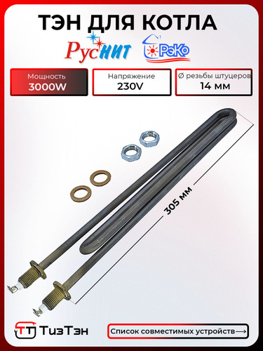 ТЭН для котла РУСНИТ, РЭКО, 3,0 кВт, 230V, L305 мм, код 30117 + прокладки и гайки