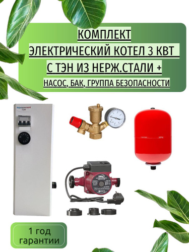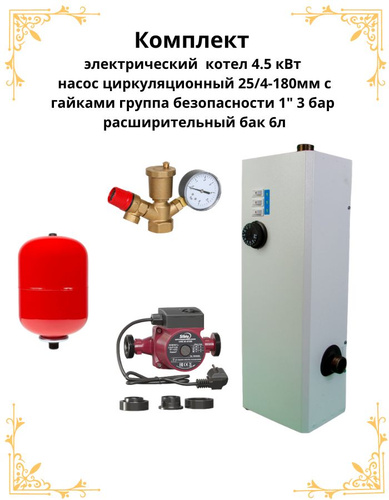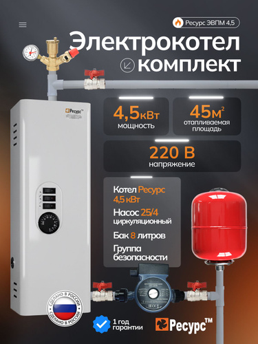 Электрокотел комплект / Котел Ресурс ЭВПМ 4,5 кВт, Циркуляционный насос для отопления 25/4, Группа безопасности, Расширительный бак 8 л