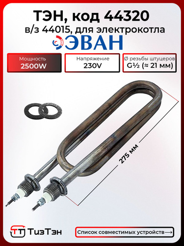 ТЭН ЭВАН 2,5 кВт/220V, G1/2 (21 мм), L275 мм, нерж, код 44320, для электрокотлов, с прокладками