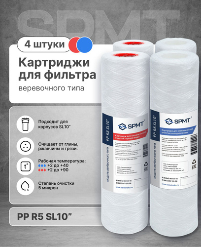 Сменный картридж для фильтра механической очистки воды, веревочного типа в магистральные системы, комплект для горячей и холодной воды, SL10 (254мм х63мм) поры 5мкм, 4шт.