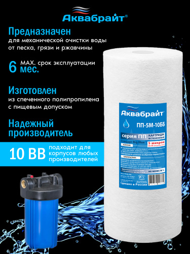 Картридж полипропиленовый Аквабрайт ПП-5 М-10 ББ для фильтра воды 10 Big Blue, 5 мкм, для механической очистки воды