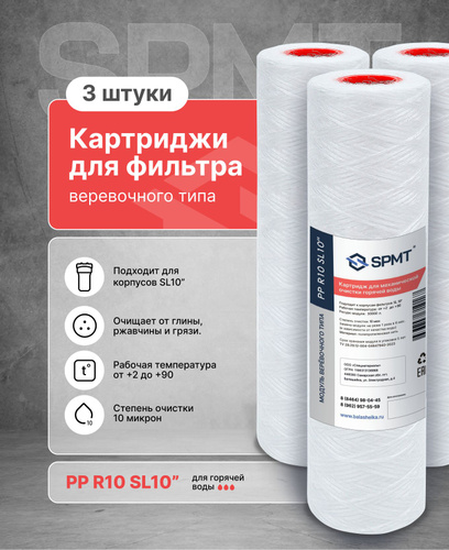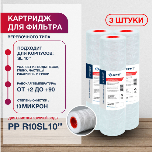 Сменный картридж для фильтра механической очистки воды, веревочного типа в проточные магистральные системы горячей воды, SL10 (254ммх63мм), пористость 10мкм, 3шт.