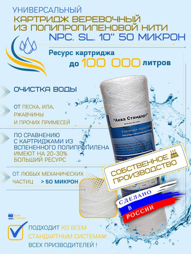 Картридж из полипропиленовой нити NPC.SL.10" 50 микрон, веревочный фильтр грубой и механической очистки воды, намоточный / нитяной / шнур