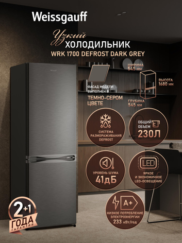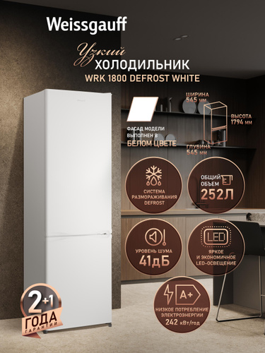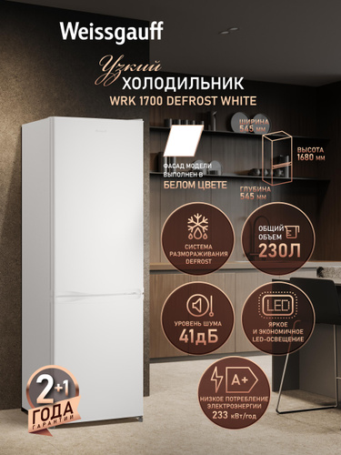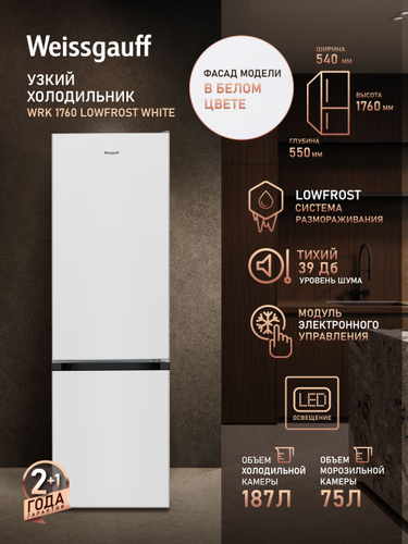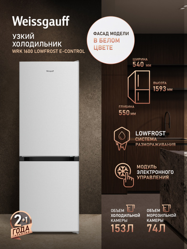 Weissgauff Холодильник Двухкамерный шириной 54 см WRK 1600 LowFrost E-control, Суперохлаждение, Общий объём 227 л, Ящик для овощей и фруктов, Полки из закаленного стекла, Перенавешиваемые двери, LED-освещение, Класс энергопотребления А+ , белый, прозрачный