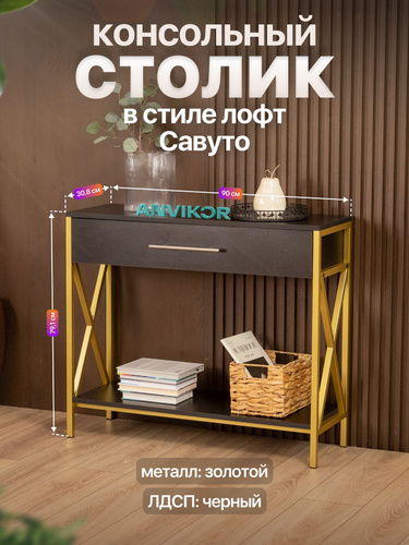 Туалетный столик консольный напольный с ящиком лофт Савуто золотой/черный