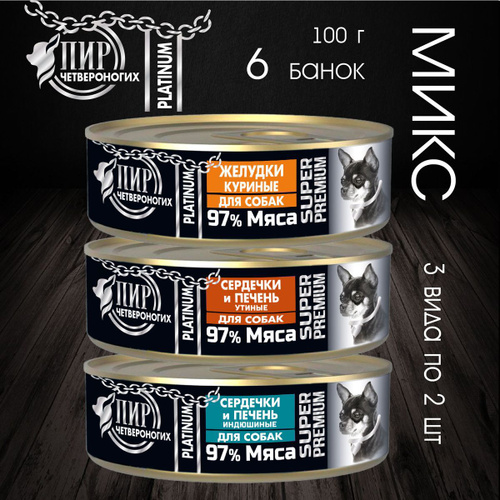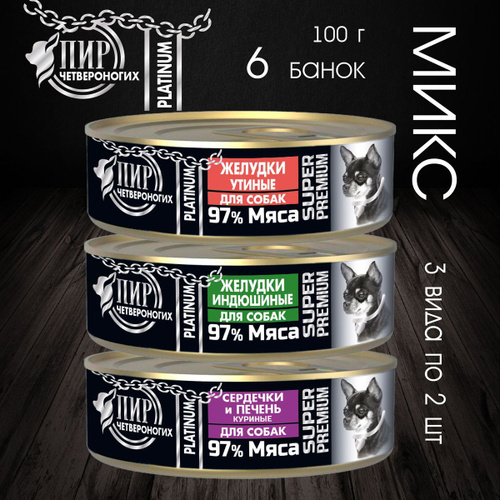 Корм для собак ПИР четвероногих, PLATINUM, желудки утиные, желудки индюшиные, сердечки и печень куриная 6 шт х 100 гр