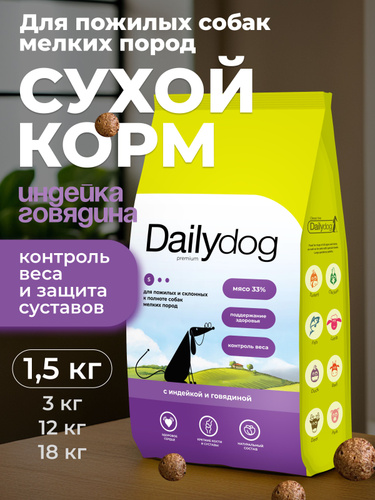 Корм сухой Dailydog для пожилых собак и склонных к полноте, мелких пород, с индейкой и говядиной, контроль веса, здоровье суставов и долгая активная жизнь, 1,5 кг