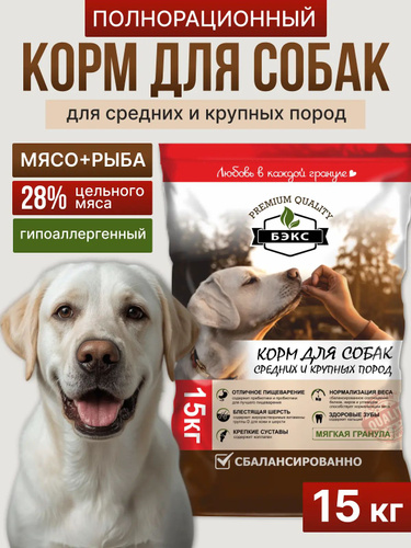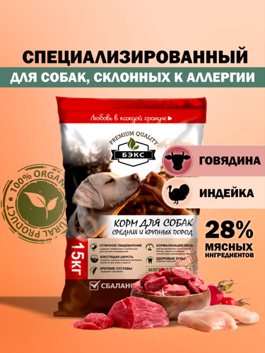 Натуральный полнорационный гипоаллергенный сухой корм для собак крупных и средних пород БЭКС, 15 кг