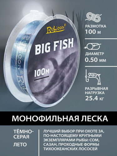 Леска для рыбалки RUBICON Big Fish 100m 0,50 мм , тёмно-серая толстая / Леска на сома, морская, для жерлиц, для карпа