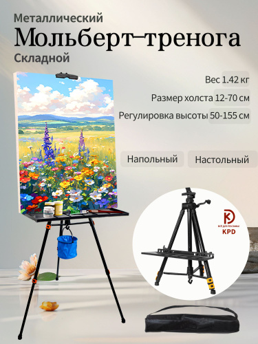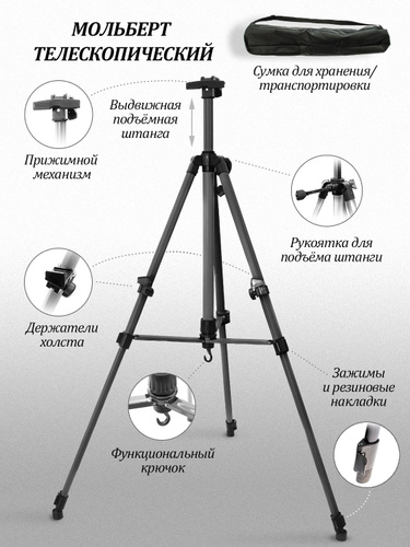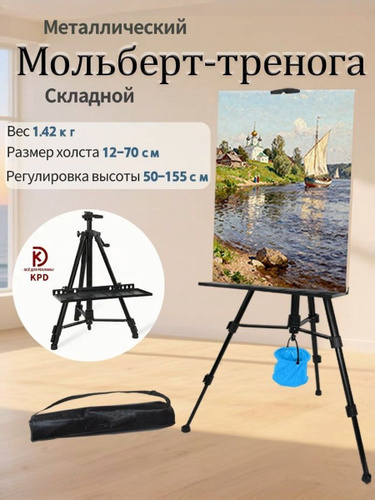 Мольберт-тренога алюминиевый, легкий и устойчивый, телескопический, складной с полкой и чехлом, 55х110х160 см идеален для художников и студентов