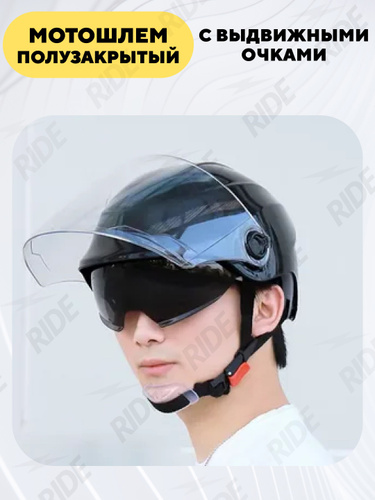 Шлем полузакрытый с выдвижными солнцезащитными очками, открытый мотошлем для мопеда, скутера (черный)