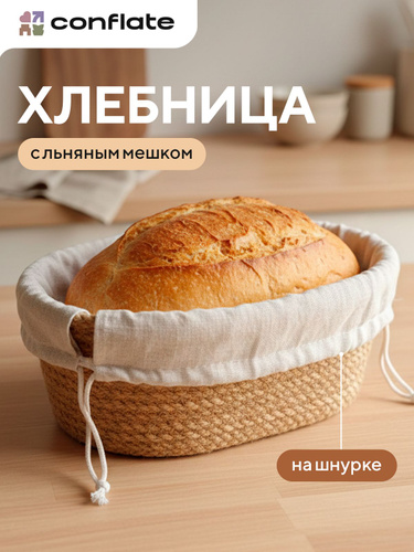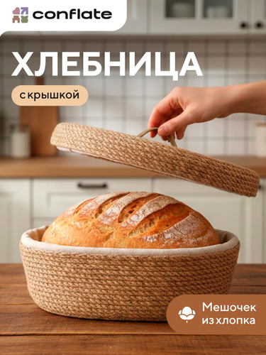 Хлебница плетёная с льняным мешком и крышкой ELCASA, 35х25х13 см, черная