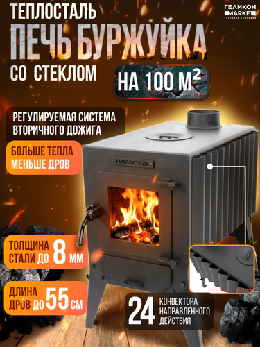Печь буржуйка отопительная для дома и бани со СТЕКЛОМ и конфоркой для дома до 100 кв.м./ гаража / палаток Теплосталь Стандарт