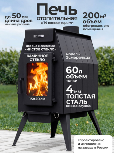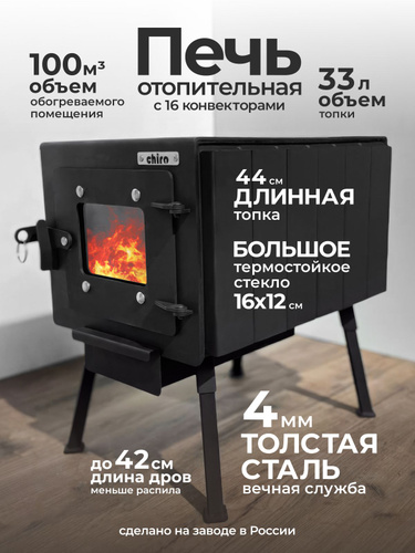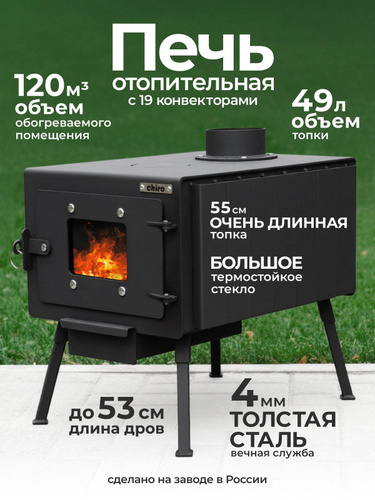 Печь буржуйка отопительная со стеклом с 19 конвекторами на 120 м3 из толстой стали 4 мм для гаража, дачи, дома, палатки, бани, буржуйка дровяная на века CHIRO