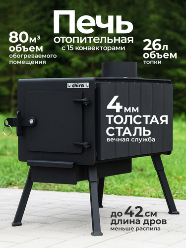 Печь буржуйка отопительная с 15 конвекторами на 80 м3 из толстой стали 4 мм для гаража, дачи, дома, палатки, буржуйка дровяная на века CHIRO