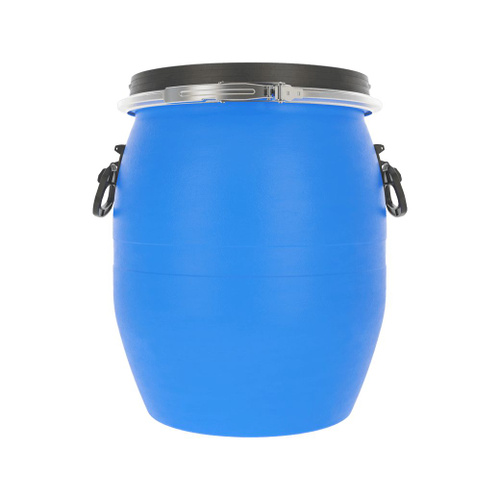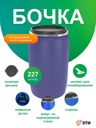 Бочка пластиковая 227 л с герметичной крышкой OPEN-TOP, d 58 см, с кольцом, высота 98 см производство ЗТИ Сибирь. Крышка с уплотнителем герметично закрывает бочку, усиленные ручки