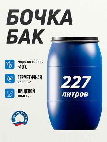 Пластиковая пищевая бочка, бак для воды с крышкой и хомутом 227 литров