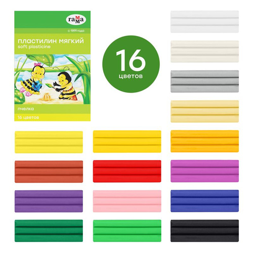 Пластилин восковой мягкий Гамма "Пчелка", 16 цветов, 240г, со стеком
