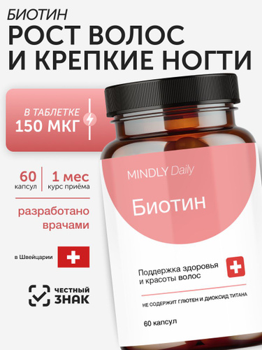 Биотин 150 мкг (Витамин B7), 60 капсул, БАД Mindly Biotin, комплекс для поддержки кожи, волос и ногтей, обменных процессов и энергии, для женщин и мужчин