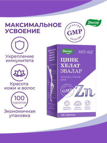 Цинк хелат, Эвалар, бад для укрепления иммунитета, для поддержания красоты и молодости, для здоровья кожи, волос и ногтей, 100 таблеток, 25 мг.