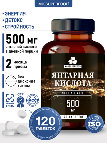 Янтарная кислота 500 мг 120 таблеток Miosuperfood Миофарм. БАД для иммунитета, нервной системы, энергии. Витамины для мужчин и женщин