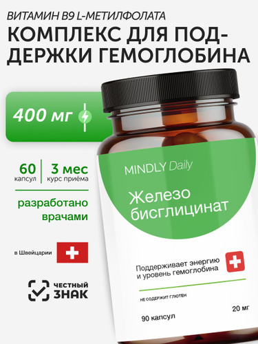 Железо бисглицинат 20 мг, 60 капсул, БАД MINDLY Daily Iron, легкоусвояемое железо для поддержки энергии, кроветворения и иммунной системы, для женщин и мужчин