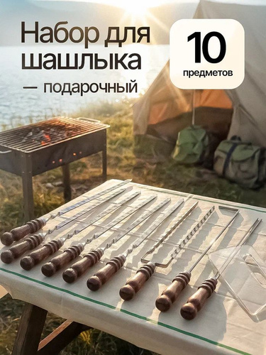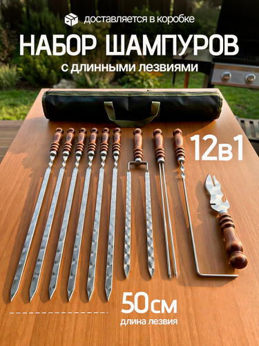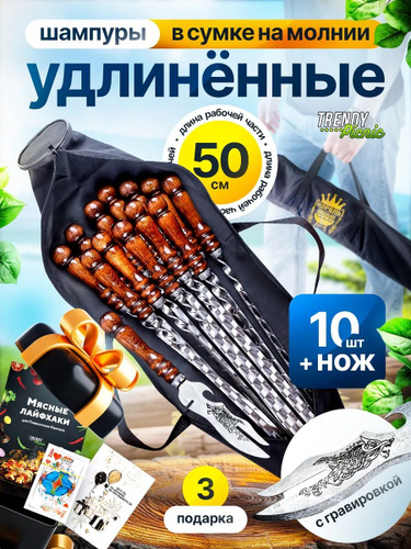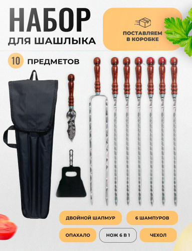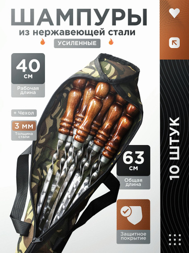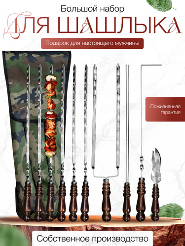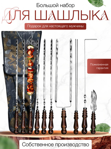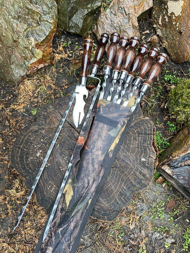 Набор шампуров 10 шт в сумке-чехле, шампура с деревянными ручками удлиненные 50см
