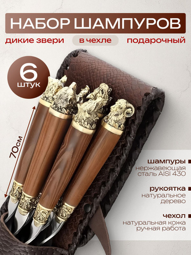Набор подарочный для мужчин, шампура в чехле 6 шт. 70 см. плоские "Дикие звери" MANS GIFT, для мангала на дачу, подарок брату и отцу на день рождение, шашлычный набор для барбекю с деревянной ручкой