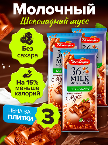 Шоколад пористый молочный Победа без сахара со стевией 3 шоколадки